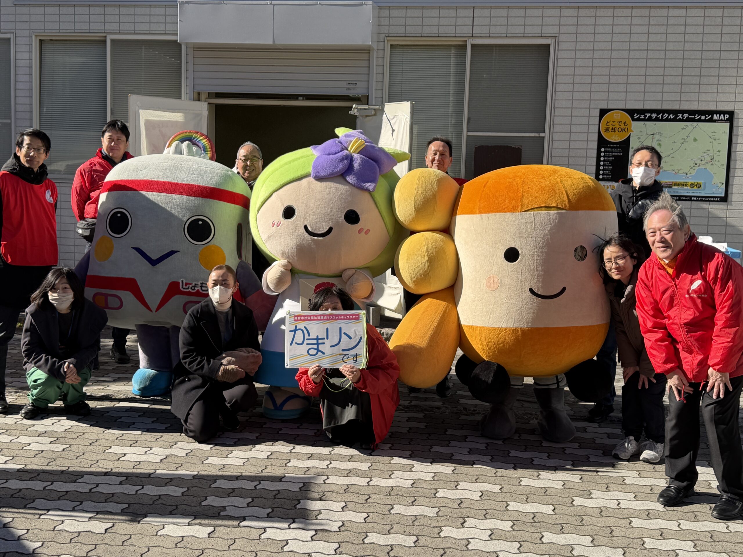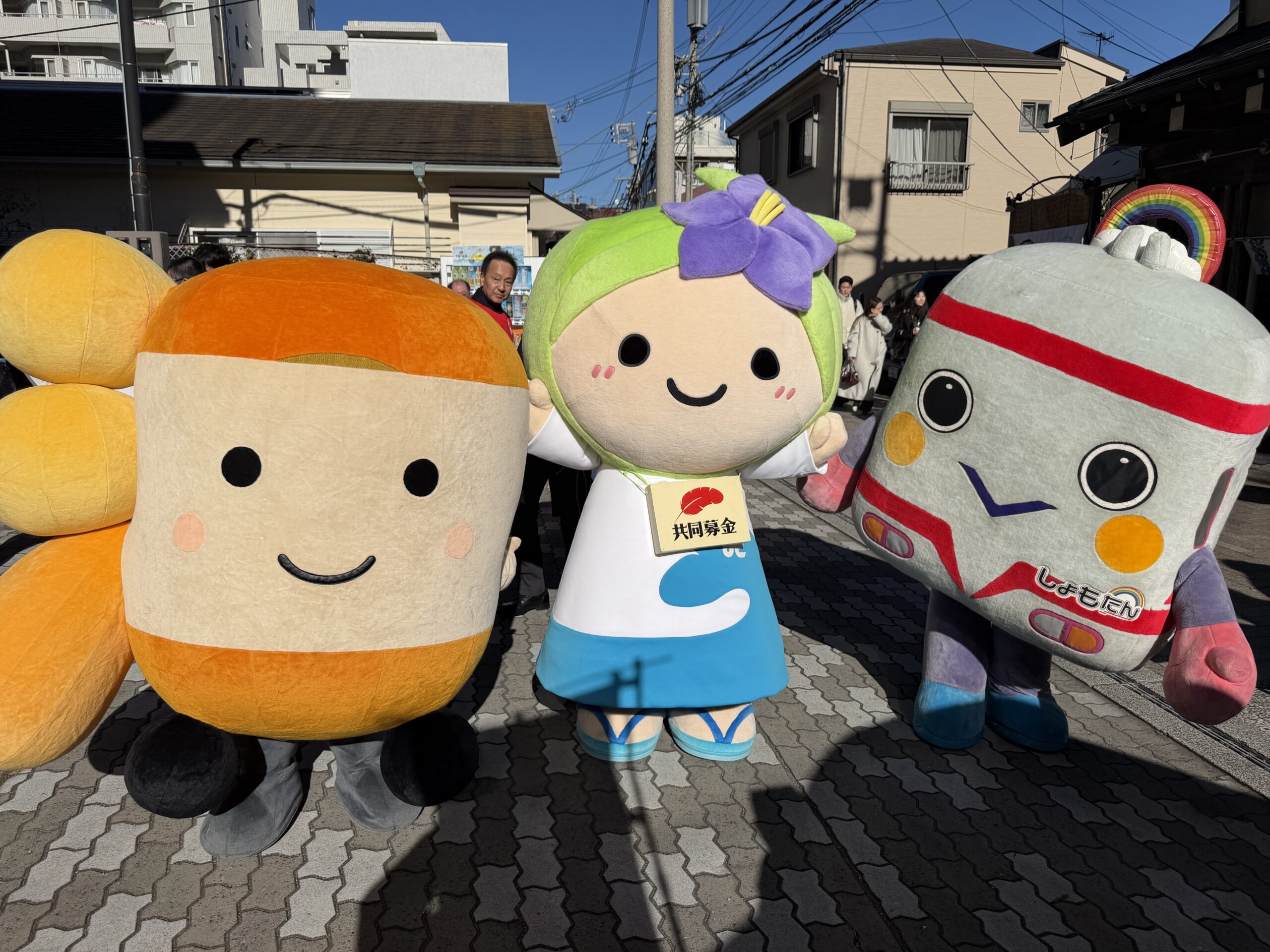 当日は、江ノ電「えのん」と湘南モノレール「しょもたん」、鎌倉市社会福祉協議会「かまりん」の各マスコットと一緒に募金の協力を呼びかけました。