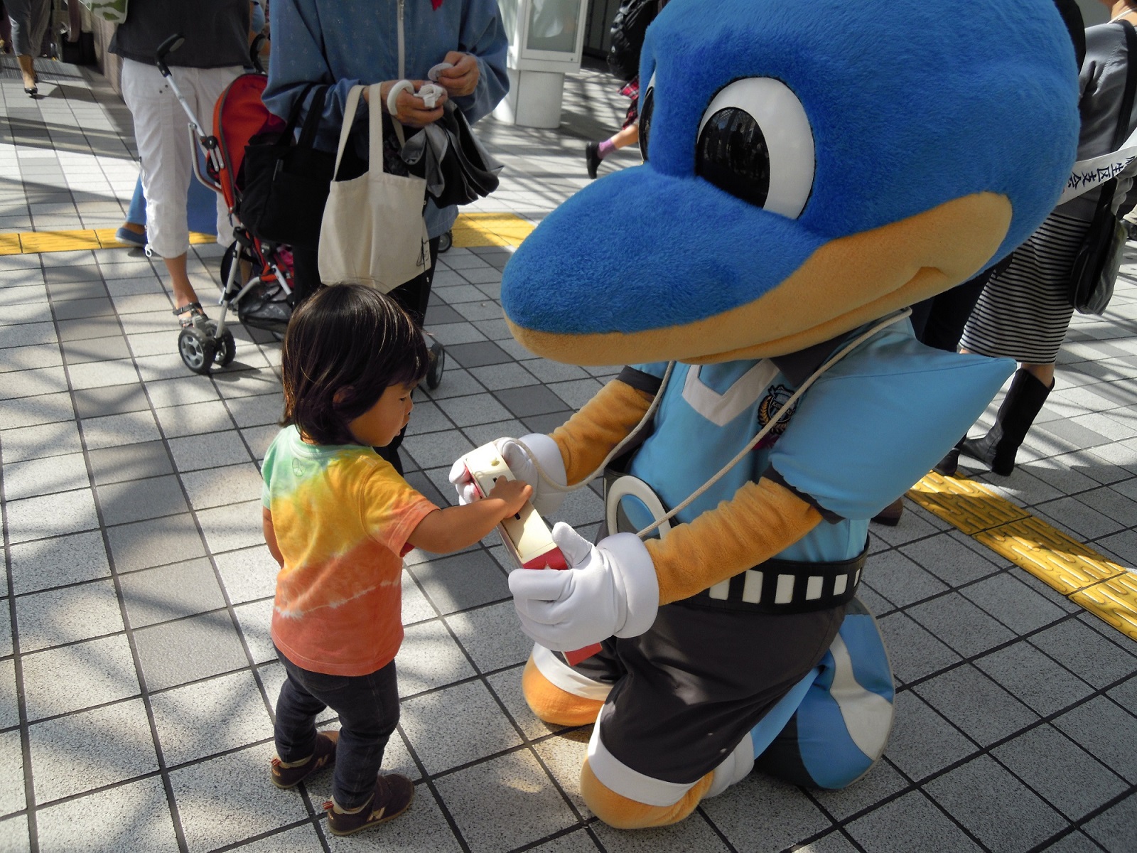 10月3日(金)は、小田急線・新百合ヶ丘駅南口で街頭募金ボランティアの皆さんと一緒に募金協力を呼びかけました。道行く人たちに、愛嬌良く手を振って協力を呼びかける“ふろん太”に、子どもたちは大喜び。